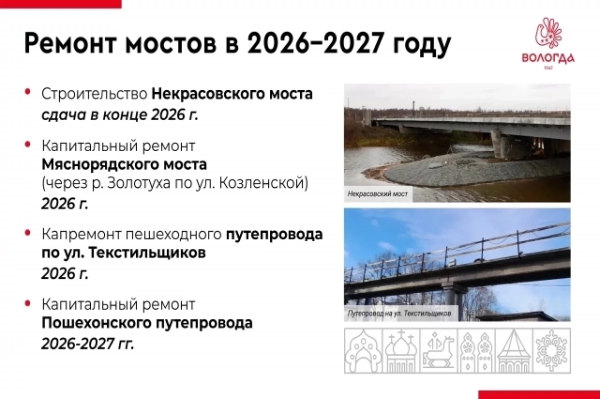 К концу 2026 года будет завершено строительство Некрасовского моста, он станет частью будущего Малого транспортного кольца Вологды. Завершится и ремонт пешеходного путепровода в створе улицы Текстильщиков. Инженерное сооружение капитально отремонтируют, включая пролетное строение и его опоры, лестничные сходы, мостовое полотно, ограждения, освещение.
